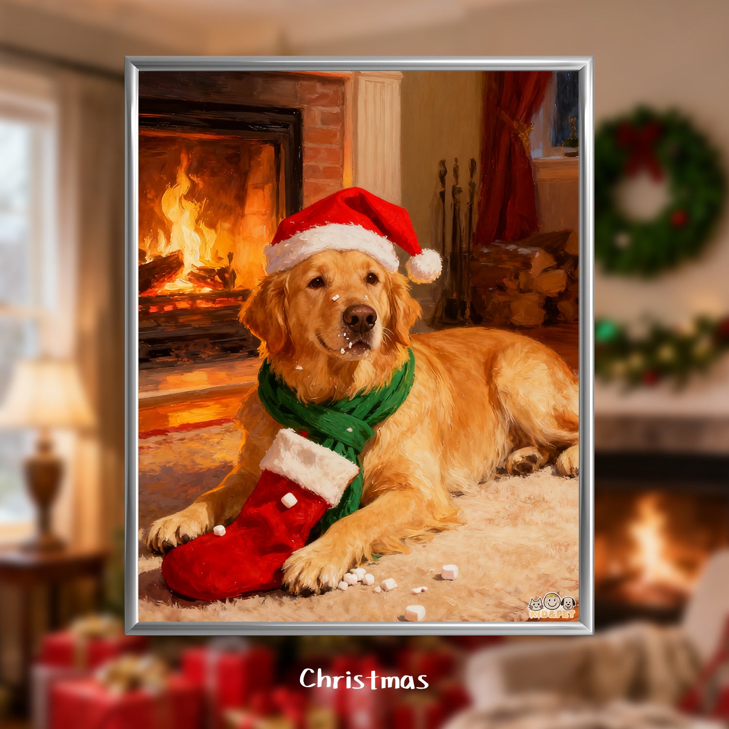 Christmas Art Print - Santa Hat Dog Holiday Decor - Festive Wall Painting - Golden Retriever